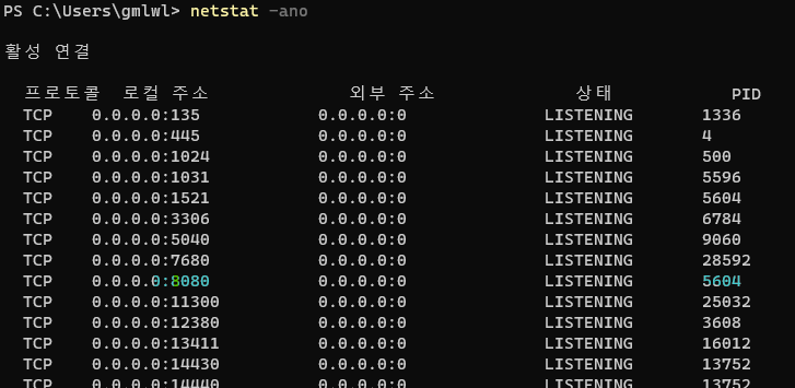 2. 아래 명령어를 통해 8080 포트를 실행중인 프로세스ID(PID)를 확인한다.