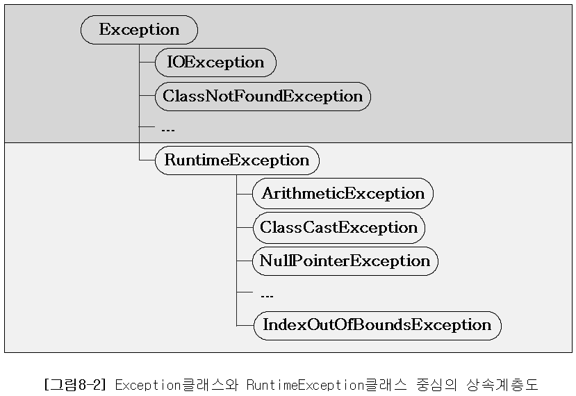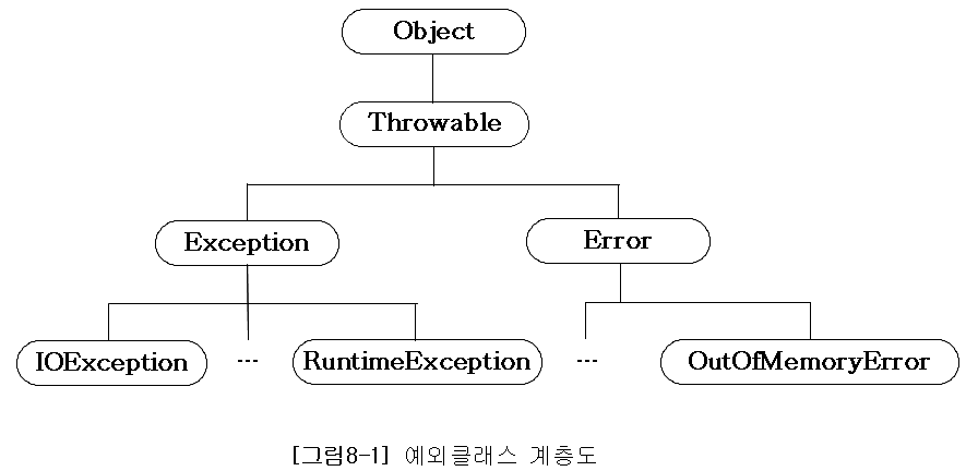 예외(exception) : 프로그램 코드에 의해서 수습될 수 있는 다소 미약한 오류 >> 예외는 처리해야 함