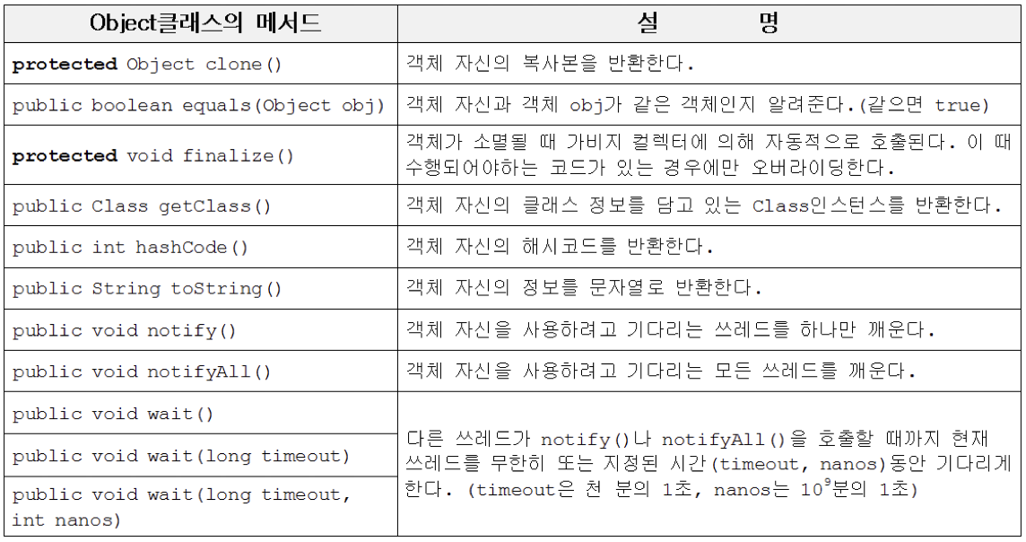 : 최상위 클래스이므로 모든 클래스는 Object 클래스의 자식이므로 항상 사용이 가능