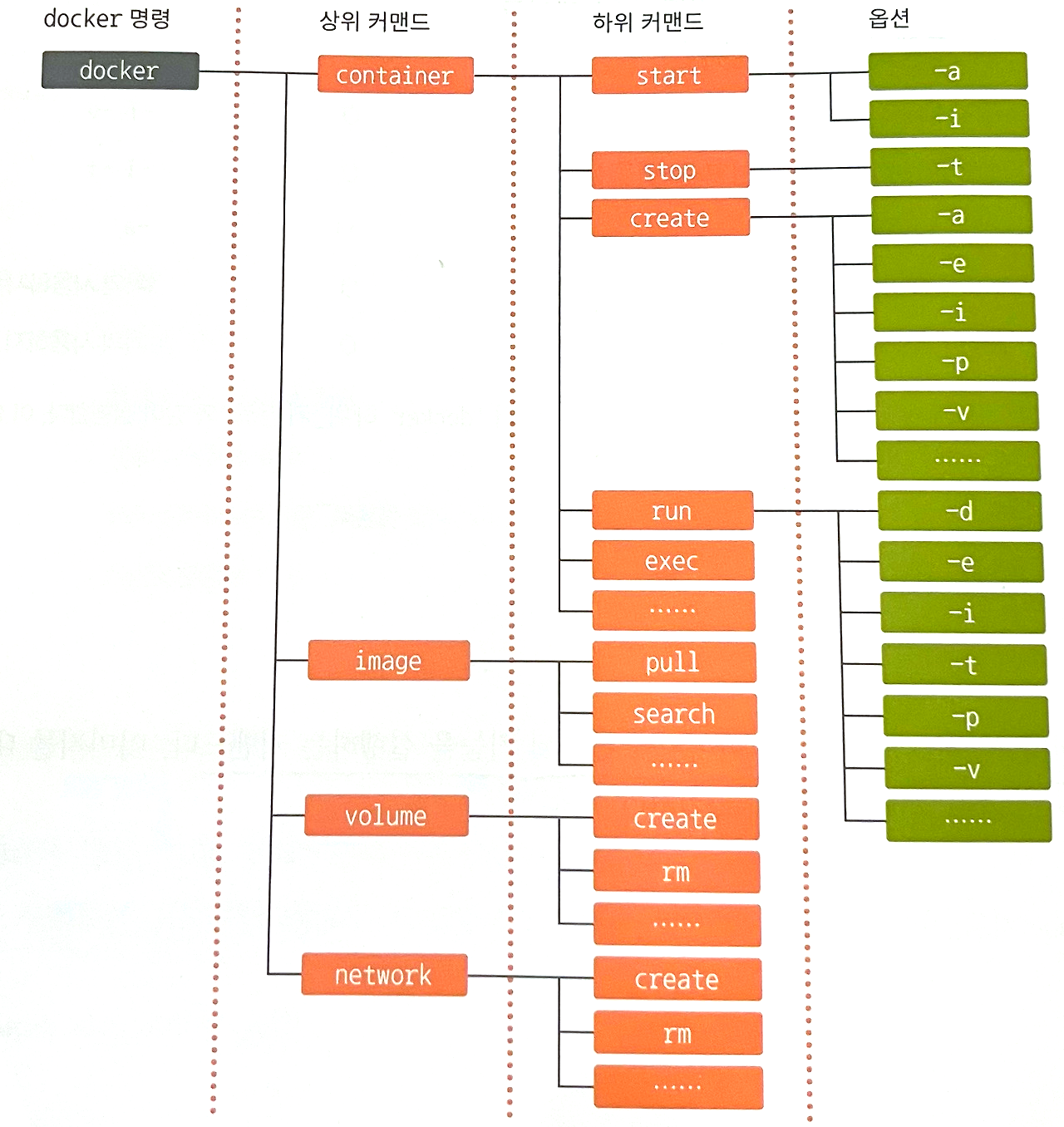 : 도커 명령어의 기본 뒤에 '옵션'과 '인자'라는 추가 정보가 붙는다