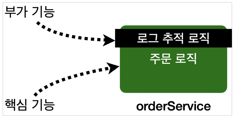 - 핵심 기능인 '주문로직'과 부가 기능인 '로그 추적 로직'이 하나의 객체로 들어감