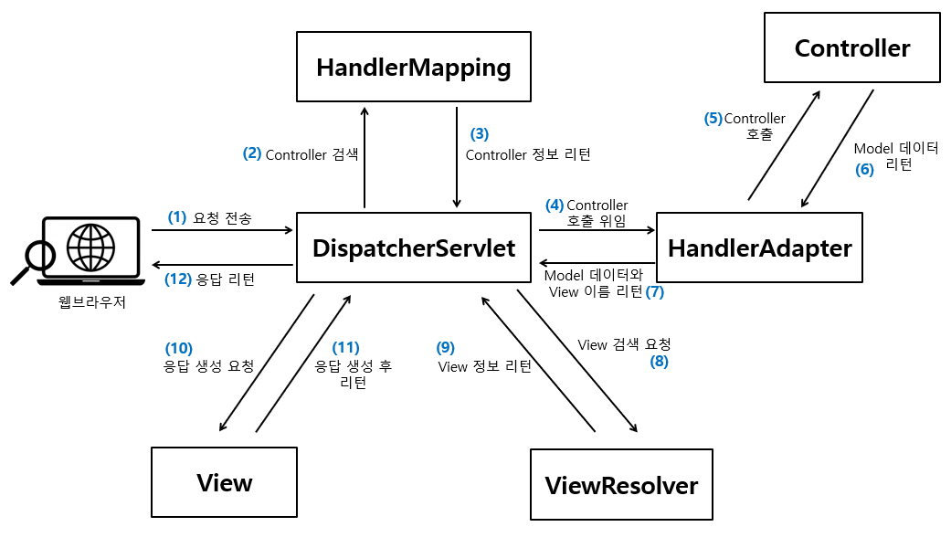 6) Controller의 Handler 메서드는 비즈니스 로직 처리 후 리턴 받은 Model 데이터를 HandlerAdapter에 전달